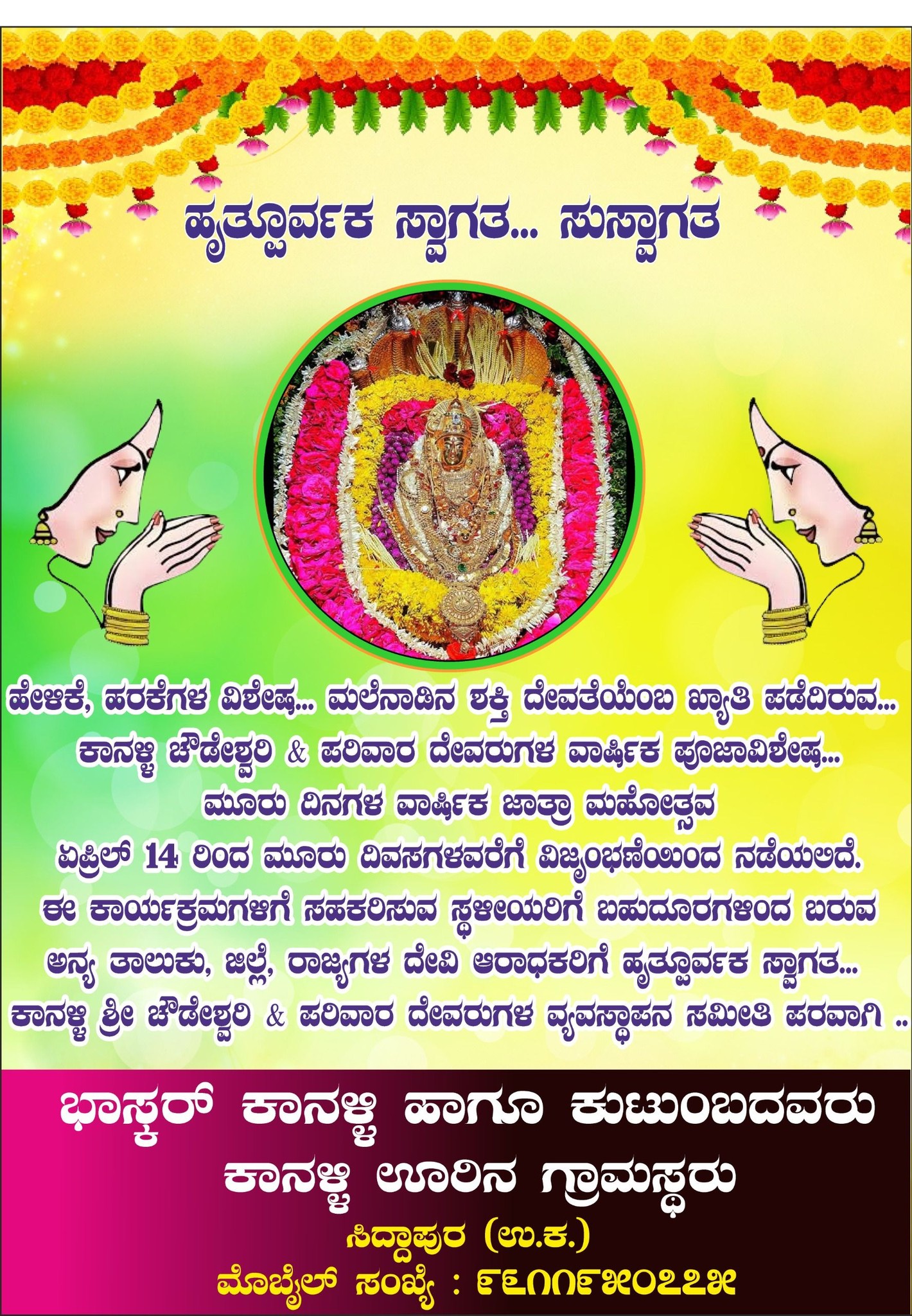 ಸಿದ್ದಾಪುರ: ಜಿಲ್ಲೆಯ ಪ್ರಸಿದ್ಧ ಧಾರ್ಮಿಕ ಕ್ಷೇತ್ರವಾದ ಸಿದ್ದಾಪುರ ತಾಲೂಕಿನ ಕಾನಳ್ಳಿಯ ಶ್ರೀ ಚೌಡೇಶ್ವರಿ ದೇವಾಲಯದ 30ನೇ ವಾರ್ಷಿಕೋತ್ಸವ ಎಪ್ರಿಲ್ 14 ರಿಂದ 16 ರವರೆಗೆ...